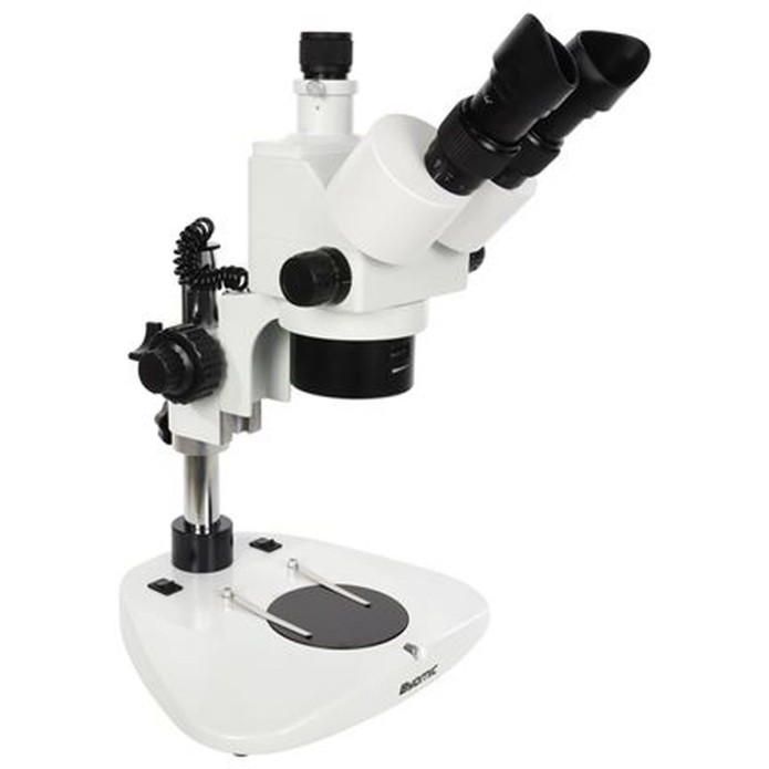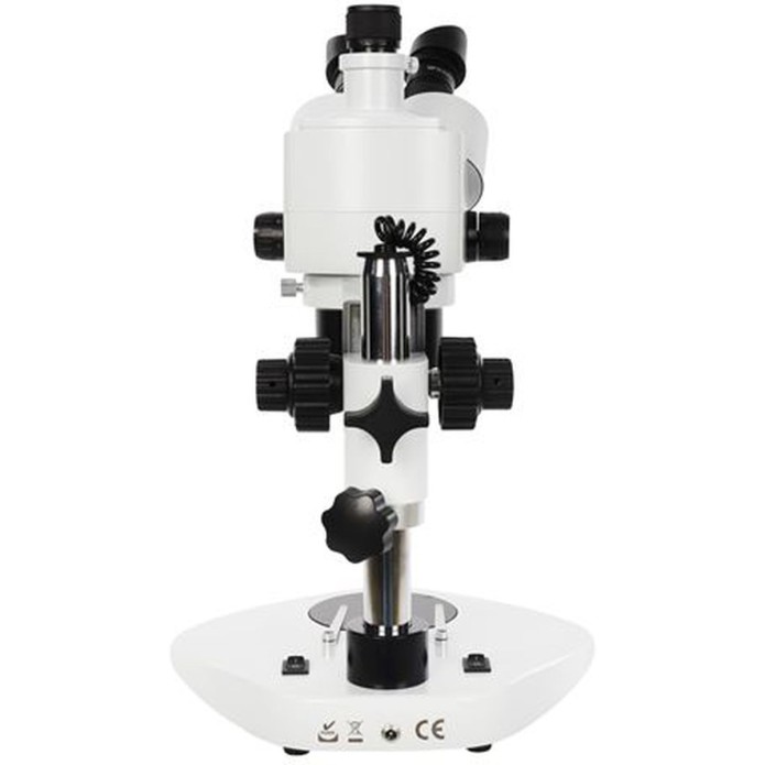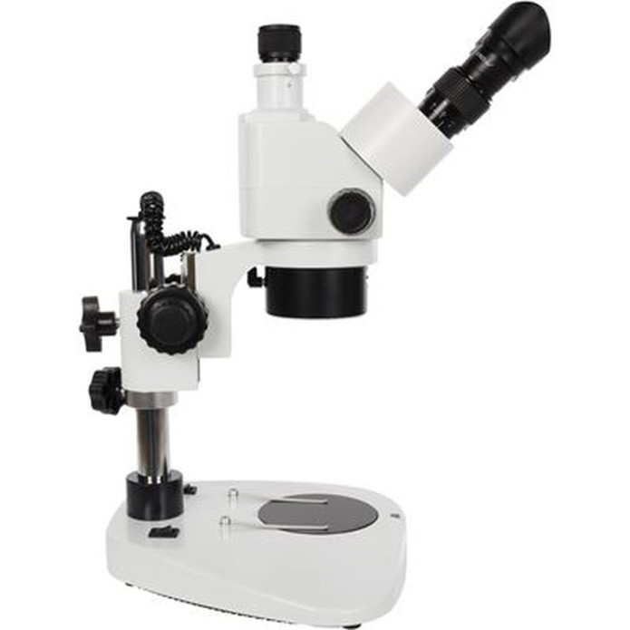 The Byomic Stereo Microscope BYO-ST341 LED is a professional trinocular microscope with plan-achromatic objectives for faithful reproduction and reduction of chromatic abberation. The BYO-ST341 LED is used by advanced users for professional purposes. Because the microscope has two plan achromatic zoom lenses (adjustable from 0.75x - 5x), a magnification of 7.5 - 50x can be achieved with the two wide angle eyepieces of 10x. It is possible to adjust the dioptre for both eyes so that extremely sharp images can be obtained during observations. Illumination The lighting can be operated with the two switches. The switch on the left is to switch the backlight on or off. The switch on the right is for the illumination which can also be changed in brightness with the wheel on the front. This ensures that the sample always has the right amount of light. The maximum height is approximately 220 mm, measured between the table and the objective. Larger objects are also possible, because the microscope can be rotated 360°. In addition to the Ø95mm dialect slide, a Ø95mm contrast plate in black and white is also supplied, so that you can also work with contrast.
